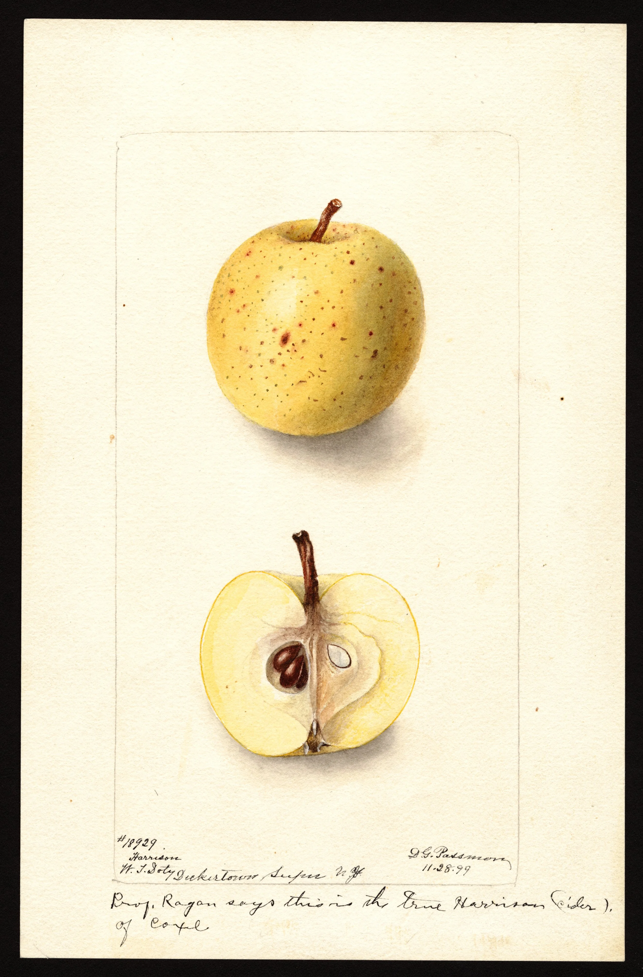 Like many regional American apples, especially those used primarily for cider, the Harrison disappeared from cultivation with the early 20th century rise of urbanization, the commodification of the apple industry, and the arrival of Prohibition. It was thought to have been lost, and possibly extinct, until a lone Harrison tree was rediscovered in 1976 in Livingston (NJ) by Vermont apple hunter, Paul Gidez. Since that discovery, scion wood from trees originating in Gidez’s Harrison orchard has been distributed to farmers throughout the country, much of it being given to small-scale orchardists by the late Tom Burford, one of the world’s foremost authorities on historic American apple cultivars.